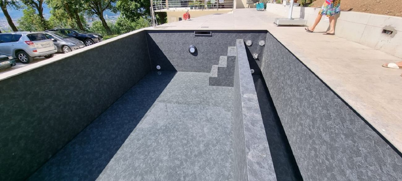 - Installation d'un volet immergé avec caillebotis immergé en IPE dans le sens des 6m de la piscine